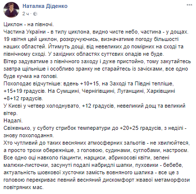 Об этом сообщает синоптик Наталья Диденко на своей странице в Facebook.