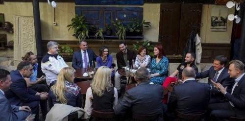 Петр Порошенко пошел на кофе вместе с вице-премьер-министром Геннадием Зубко, председателем Львовской ОГА Олегом Синюткой, председателем Львовского облсовета Владимиром Гирняком, директором департамента культуры Львовской ОГА Мирославой Туркало, народным депутатом от БПП "Солидарность" Богданом Дубневичем.