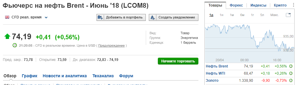 В пятницу, 20 апреля мировые цены на нефть марки Brent превысили отметку $74. Это произошло после кратковременного "твиттер-снижения".