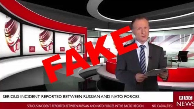На видео мрачный ведущий в студии, похожей на студию ВВС, сообщает о "серьезном инциденте между Россией и НАТО".