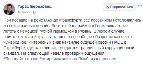 Один из пассажиров рейса Киев - Франкфурт вез в Германию балалайку. Об этом в Facebook рассказал политолог Тарас Березовец, которого в СМИ связывают с Банковой.