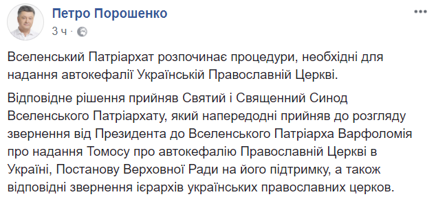 "Вселенский Патриархат начинает процедуры, необходимые для предоставления автокефалии Украинской Православной Церкви", - ни много, ни мало заявил Петр Порошенко.