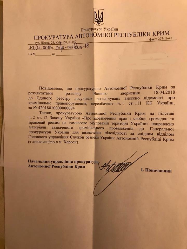 В результате, как следует из писем ведомств, размещенных Портновым, СБУ приобщила его информацию к уже существующему делу, а прокуратура АР Крым внесла новое уголовное производство, которое касается Картошкина, в единый реестр досудебных расследований.