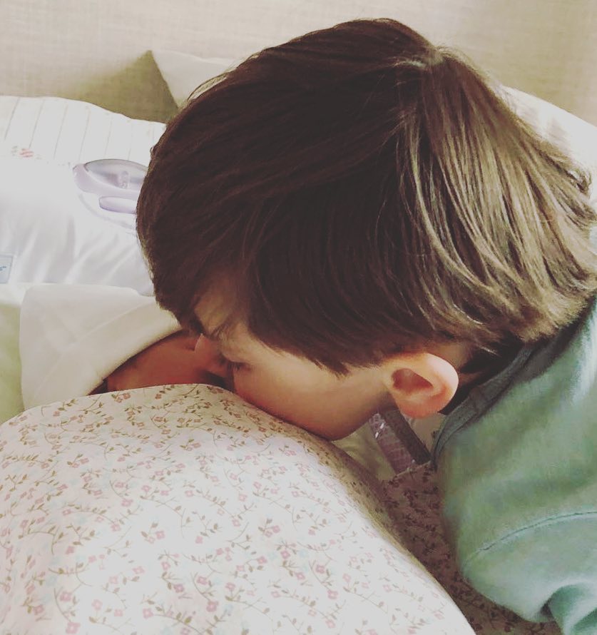 На фото запечатлено мгновение знакомства сына Марка с сестренкой.