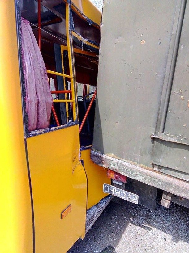 В Бахмуте Донецкой области произошло дорожно-транспортное происшествие при участии маршрутки и военного грузовика.