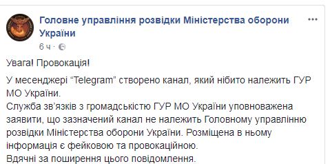 "В мессенджере Telegram создан канал, который якобы принадлежит ГУР МО Украины. Служба по связям с общественностью ГУР МО Украины уполномочена заявить, что указанный канал не принадлежит Главному управлению разведки Министерства обороны Украины. Размещенная в нем информация является фейковой и провокационной", - говорится в сообщении.