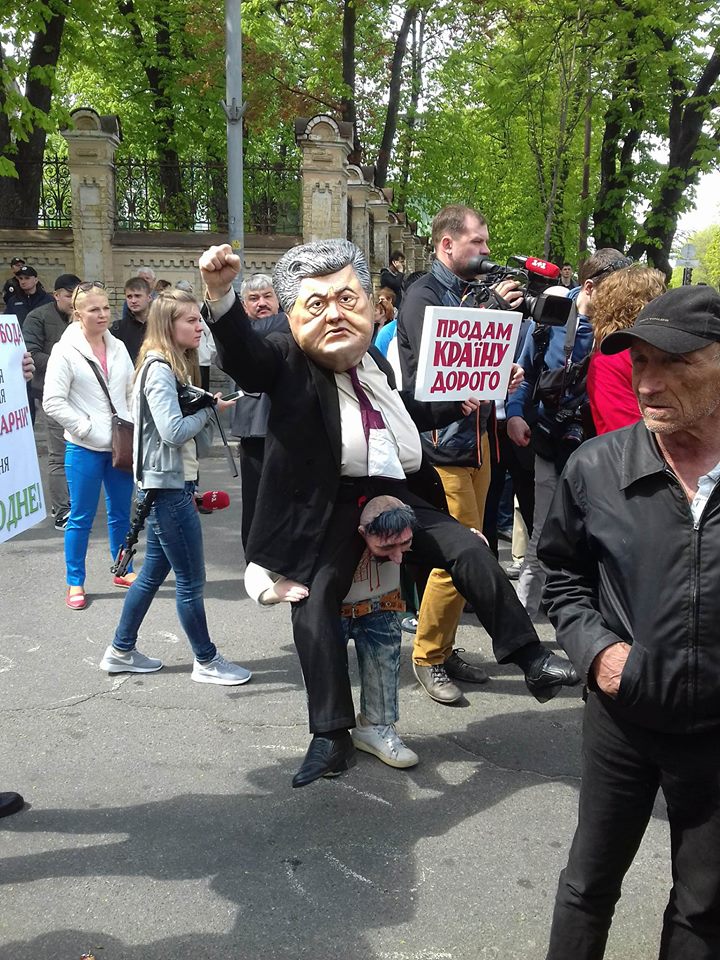 Протестующие также били палками по пустым бочкам. На акцию принесли большую куклу Петра Порошенко с плакатом: "Продам Украину. Дорого".