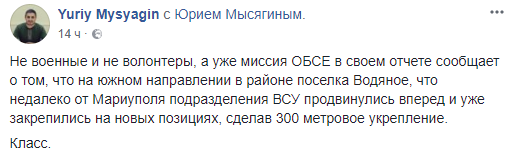 "Не военные и не волонтеры, а уже миссия ОБСЕ в своем отчете сообщает о том, что на южном направлении в районе поселка Водяное, что недалеко от Мариуполя подразделения ВСУ продвинулись вперед и уже закрепились на новых позициях, сделав 300 метровое укрепление2, - сообщил волонтер.