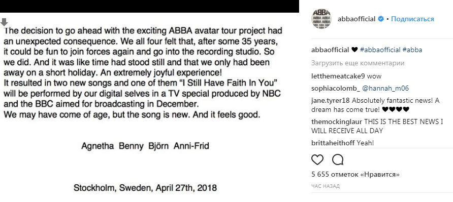 Ранее "Страна" сообщала, что группа ABBA объявила о виртуальном турне в 2019 году.