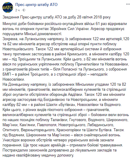 Так, на Луганском направлении, из запрещенных 122-мм артиллерии,120 и 82 мм минометов боевики обстреляли опорные пункты вблизи Новотошковского. Также 122-мм артиллерийские системы и вооружение танка противник применил в районе Крымского, а минометы калибра 120 мм – под Троицким и Луганским.