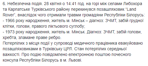 Сообщается, что 28 апреля, на горе между селами Лыбохора и Карпатское Турковского района перевернулся внедорожник Land Rover, в результате чего получили травмы граждане Беларуси.