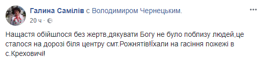"К счастью обошлось без жертв, слава богу не было поблизости людей, это произошло на дороге возле центра  села Рожнятив! Ехали на тушение пожара в село Креховичи!" - говорится в сообщении.