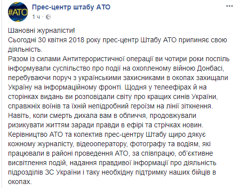 "Сегодня 30 апреля 2018 пресс-центр штаба АТО прекращает свою деятельность.