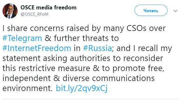 "Я разделяю обеспокоенность многих организаций гражданского общества по поводу блокировки Telegram и других угроз свободе интернета в России. И я напоминаю о моем заявлении, в котором я просил власти пересмотреть эту ограничительную меру и продвигать свободную, независимую и разностороннюю коммуникационную среду", - заявил Дезир.