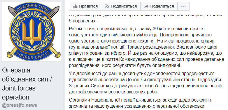 "Утром 30 апреля покончил жизнь самоубийством один военнослужащий. Предварительной причиной самоубийства стала неразделенная любовь. На месте работала следственная группа Национальной полиции. Продолжается расследование", - говорится в заявление штаба, опубликованном в Facebook.