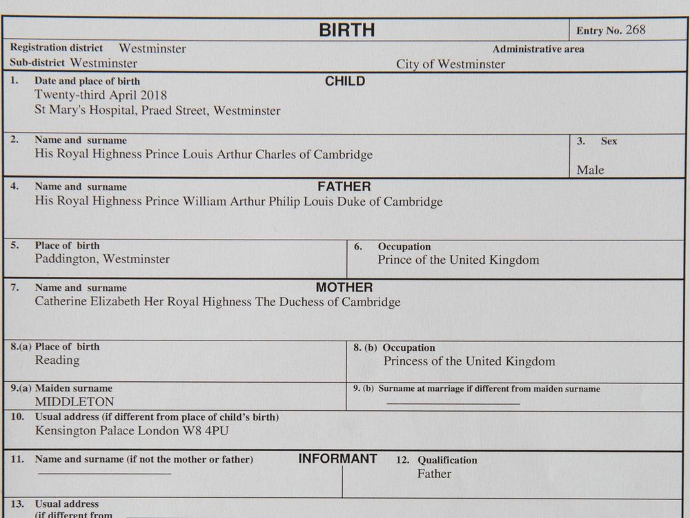 Также в свидетельстве указана информацию о родителях Луи. В графе "род занятий" в Уильяма и Кейт указано "принц Великобритании" и "принцесса Великобритании".