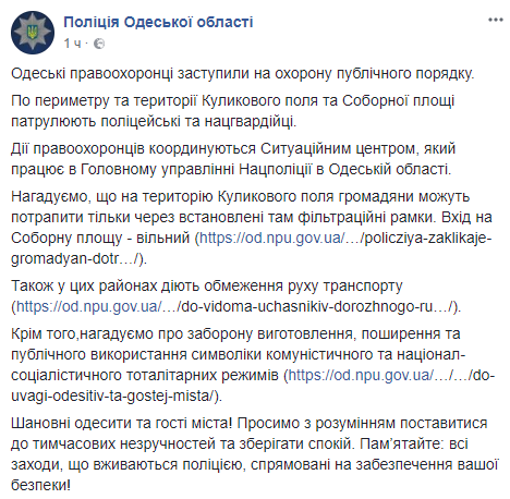 Полиция Одессы обнародовала список запрещенных предметов, с которыми не пустят на массовые мероприятия в годовщину трагедии 2 мая 2014 года.