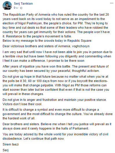 "Мне очень грустно, что до сих пор я не смог лично присоединиться к вам из-за ужасного вируса, но я следил за вами и давал комментарии, когда чувствовал, что это может что-то изменить. Обещаю скоро быть в Армении", - написал Танкян в обращении к армянам.
