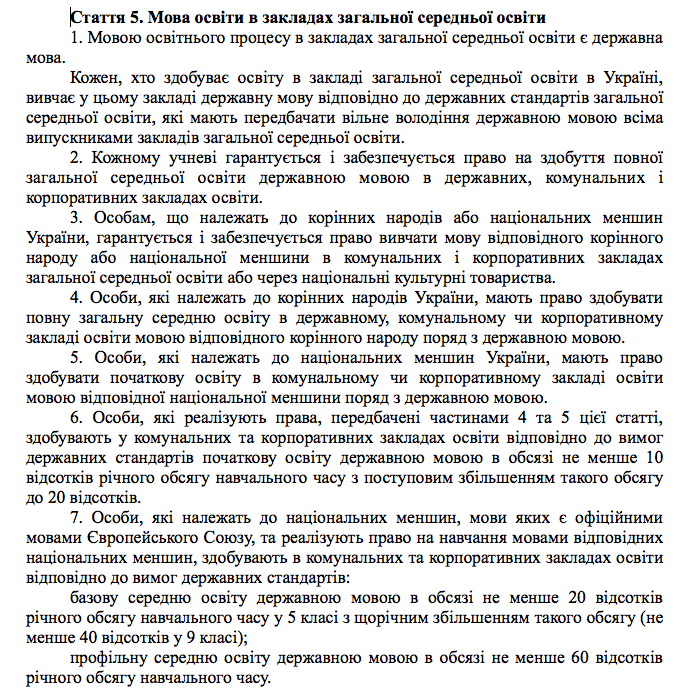 Остальное время, проведенное в школе (профильное среднее образование), ученик из "привилегированных" нацменьшинств будет учиться на родном языке (40%) и украинском (60%).
