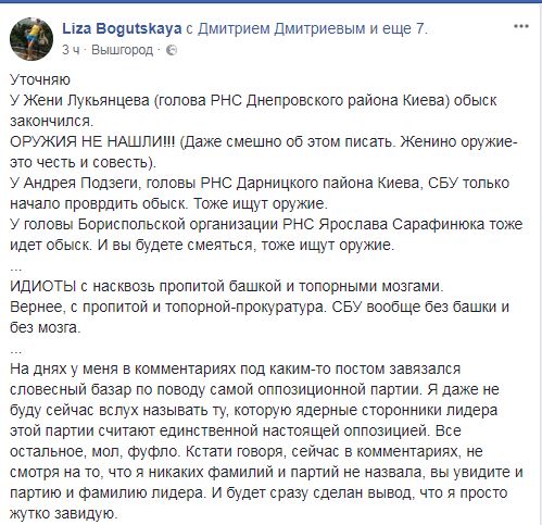 По их данным, ищут оружие, взрывчатку и деньги. Лиза Богуцкая, в частности, пишет, что у Лукьянцева обыск уже закончился, оружие не нашли. У остальных обыски продолжаются.