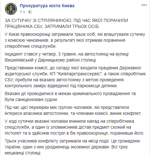Троих участников конфликта задержали на месте происшествия. "Это граждане Украины, один из них - уроженец иностранного государства. Все трое - жители столицы", - отметили в прокуратуре.