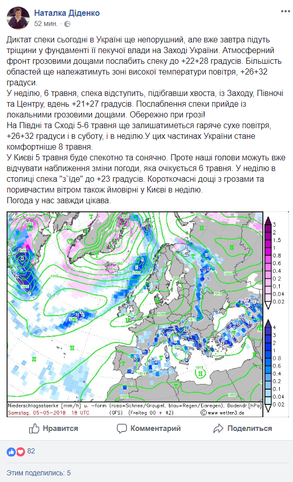 Народный синоптик Наталья Диденко сообщила, что жара спадет уже 6 мая.