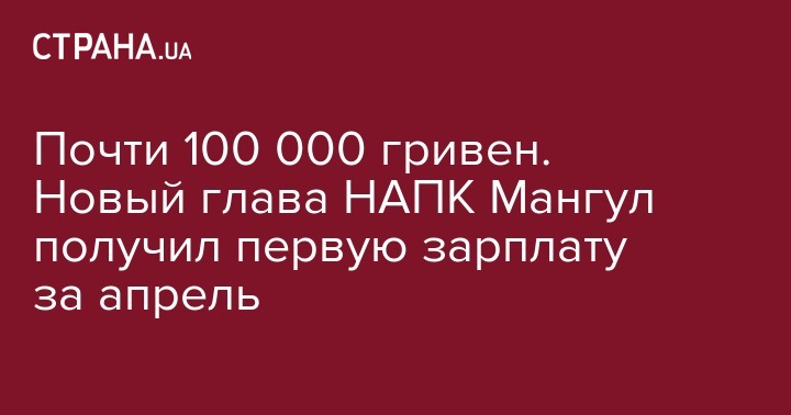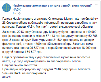Национальное агентство по предупреждению коррупции опубликовало информацию о первой заработной плате нового председателя агентства Александра Мангула за апрель этого года.