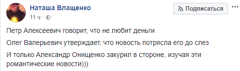 "Петр Алексеевич говорит, что не любит деньги. Олег Валерьевич утверждает, что новость потрясла его до слез. И только Александр Онищенко закурил в стороне, изучая эти романтические новости", - прокомментировал слова Порошенко телеведущая Наталья Влащенко.