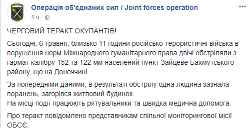 "Около 11:00 российско-террористические войска в нарушение норм Международного гуманитарного права дважды обстреляли из пушек калибра 152 и 122 мм населенный пункт Зайцево Бахмутского района Донецкой области", - говорится в сообщении.