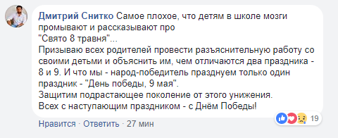 Пользователь соцсети Дмитрий Снитко призвал всех родителей провести разъяснительную работу со своими детьми и объяснить им, чем отличаются два праздника - 8 и 9 мая.