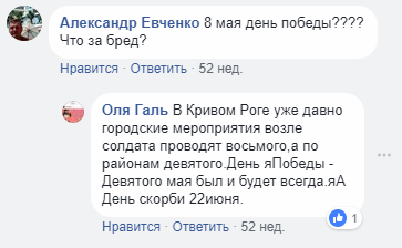 Однако и такой подход не удовлетворяет украинцев. "8 мая день победы???? Что за бред?", - недоумевает Александр Евченко.