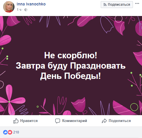 "Не скорблю! Завтра буду праздновать День Победы", - пишет Инна Иваночко, общественный деятель из Львова.