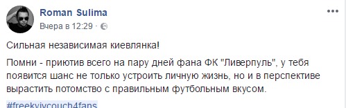 "Я не хочу, чтобы гости Champions League Final составили мнение о киевлян как о махровых жлобов и дикарей, которые "апартаментами" называют трущобы с "брежневскими" мебелью и желтыми от времени унитазами. Поэтому - приглашаю всех желающих к себе совершенно бесплатно. Локация - исторический центр города, в прогулочной доступности к месту проведения чемпионата", - написала пользователь Facebook Галя Плачинда.