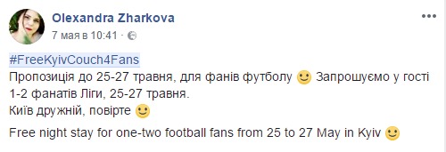 Киевляне стали приглашать к себе гостей лиги чемпионов бесплатно переночевать. Под хештэгом #freekyivcouch4fans  они публикуют в социальных сетях свои приглашения для гостей финала Лиги Чемпионов.
