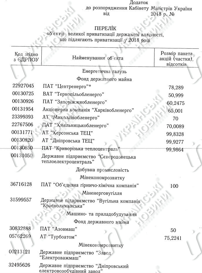 Согласно распоряжению, 18 объектов, которые находятся в управлении ФГИ будут выставлены на продажу: энергопоставляющие компании "Тернопольоблэнерго", "Запорожьеоблэнерго", "Харьковоблэнерго", "Николаевоблэнерго", "Хмельницкоблэнерго", теплоэлектроцентрали (ТЭЦ) - Херсонская ТЭЦ, Днепровская ТЭЦ, Криворожская ТЭЦ, Северодонецкая ТЭЦ, "Азовмаш", "Турбоатом", Запорожский титано-магниевый комбинат, "Ориана", Завод алюминиевой фольги, "Президент-Отель", "Центрэнерго", Одесский припортовый завод и "Сумыхимпром".