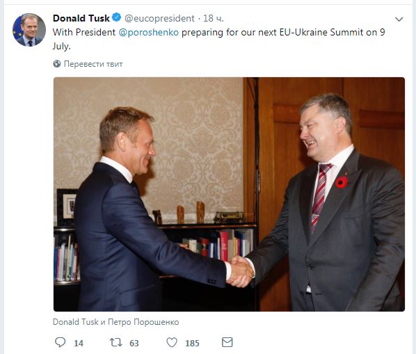 "С президентом Порошенко готовимся к нашему очередному саммиту Украина - ЕС 9 июля", - подписал он размещенную в микроблоге фотографию с президентом Петром Порошенко с их встречи, которая прошла 8 мая.