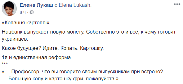 "Нацбанк выпускает новую монету. Собственно это и всё, к чему готовят украинцев. Какое будущее? Идите. Копать. Картошку. 1я и единственная реформа", - пишет в Facebook адвокат Елена Лукаш.