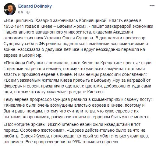Заведующая кафедрой экономики Национального авиационного университета, академик Академии экономических наук Украины Олеся Сунцова опубликовала антисемитский пост в Facebook.