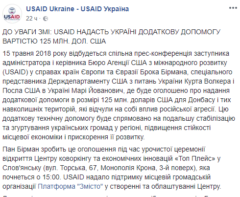 Отмечено, что объявление о предоставлении денег будет сделано во время совместной пресс-конференции руководителя Бюро Агентства  по делам стран Европы и Евразии Брока Бирмана, специального представителя Госдепартамента США по вопросам Украины Курта Волкера и посла США в Украине Мари Йованович. Пресс-конференция пройдет в Славянске.