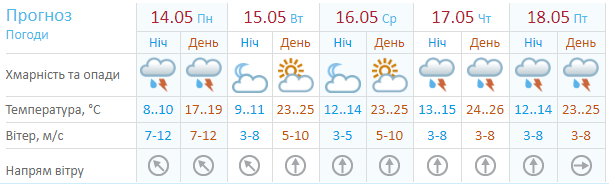 Сайт Укргидрометцентра прогнозирует грозовые дожди на этой неделе в понедельник, четверг и пятницу. Начало недели, 14 мая, Будет довольно прохладным: до+17...+19 днем. Затем потеплеет до +23...+26.