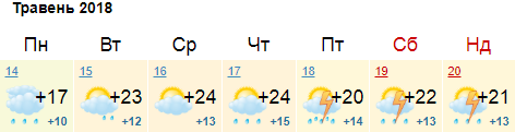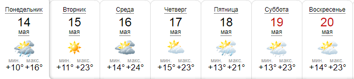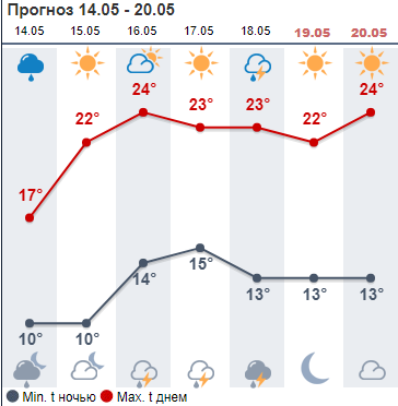 По данным сайта Sinoptik.ua обещает дождь в понедельник, пятницу и субботу. Самым холодным днем недели будет понедельник, 14 мая, до +16 днем. Далее в дневное время воздух прогреется до +21...+24.
