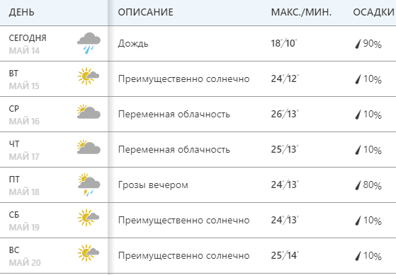 Сайт Weather.com сообщает, что дождь будет идти в понедельник, а вечером в пятницу возможна гроза. 14 мая днем +18, далее потеплеет до +24...+26.