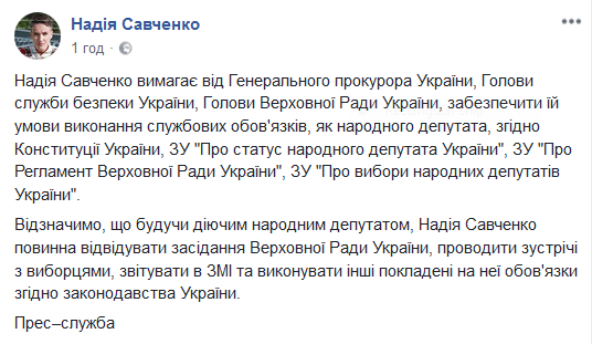 "Я, как народный депутат, требую: обеспечить мне присутствие на заседаниях Верховной Рады с целью голосования, подачи законопроектов, участия в деятельности Рады", – говорится в обращении нардепа к генеральному прокурору Юрию Луценко, главе СБУ Василию Грицаку и председателю Верховной Рады Андрею Парубию.