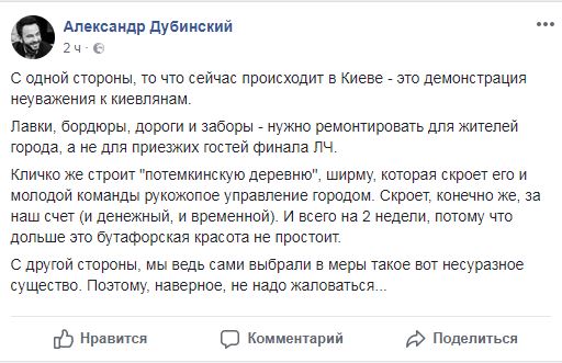 "С одной стороны, то что сейчас происходит в Киеве – это демонстрация неуважения к киевлянам. Лавки, бордюры, дороги и заборы нужно ремонтировать для жителей города, а не для приезжих гостей финала ЛЧ. Кличко же строит "потемкинскую деревню", ширму, которая скроет его и молодой команды рукожопое управление городом. Скроет, конечно же, за наш счет (и денежный, и временной). И всего на две недели, потому что дольше эта бутафорская красота не простоит. С другой стороны, мы ведь сами выбрали в мэры такое вот несуразное существо. Поэтому, наверное, не надо жаловаться", – пишет журналист Александр Дубинский.