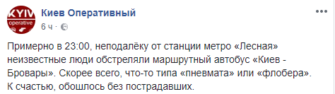 "Неизвестные люди обстреляли маршрутный автобус "Киев - Бровары". Скорее всего, что-то типа "пневмата" или "флобера", - говорится в сообщении ресурса.