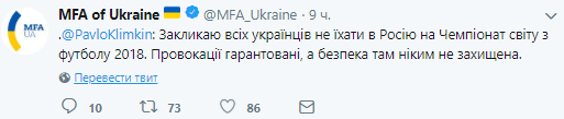 "Призываю всех украинцев не ехать в Россию на чемпионат мира по футболу - 2018. Провокации гарантированы, а безопасность там никем не защищена", -  заявил Климкин.