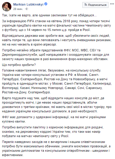 "Ответственное государство должно сделать все, чтобы обезопасить своих людей, даже несмотря на то, что они пренебрегают очевидными рисками, которые их ждут в стране-агрессоре. Нужно немедленно собрать представителей ФФУ, МИД, МВД, СБУ и Госпогранслужбы, чтобы выработать и скоординировать меры по защите наших граждан в случае возникновения форс-мажорных обстоятельств", -  написал Лубкивский.
