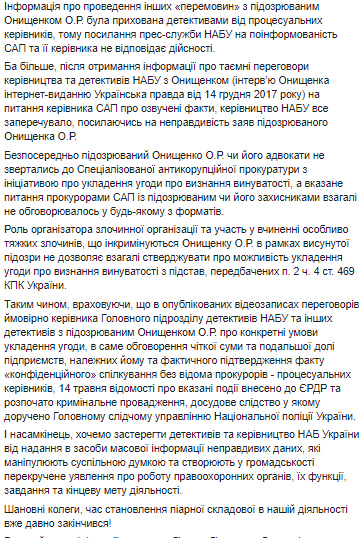 "Учитывается, что в опубликованных видеозаписях переговоров, вероятно, руководителя Главного подразделения детективов НАБУ и других детективов с подозреваемым Онищенко, идет речь о конкретных условиях заключения сделки, а именно обсуждение четкой суммы и дальнейшей судьбы предприятий, принадлежащих ему и фактического подтверждения факта "конфиденциального" общения без ведома прокуроров - процессуальных руководителей, 14 мая сведения об указанных событиях внесены в ЕРДР и начато уголовное производство", - говорится в сообщении.