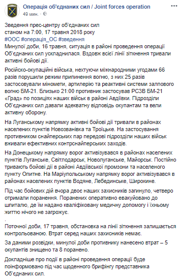 За прошедшие сутки, 16 мая, ситуация в районе проведения ООС осложнилась. Вдоль всей линии соприкосновения продолжались активные боевые действия. Позиции ВСУ подвергались обстрелу 66 раз в районах Авдеевки, Новозвановки, Троицкого, Луганского, Светлодарска, Новолуганского, Майорска, Опытного, Водяного, Лебединского, Широкино.