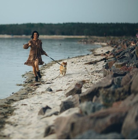 На свежих фотографиях в Instagram Даша предстает в нежном образе в легком платьице цвета кофе с молоком с собакой породы акита ину.